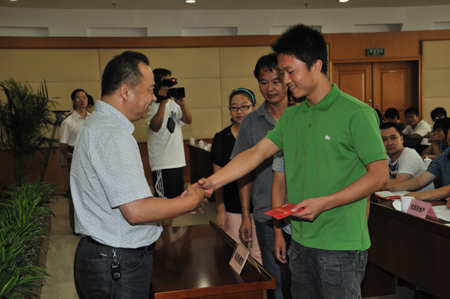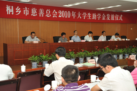 8月27日下午,桐鄉市慈善總會2010年大學新生助學金發放儀式在市政府舉行,雙箭股份也響應號召積極捐款助學。圖為董事長沈耿亮代表雙箭股份公司出席了助學金發放儀式。