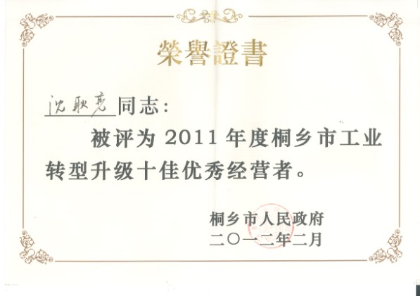 會上公布了2011年度表彰名單,我公司被評為“2011年度桐鄉市工業轉型升級十大突出貢獻企業”、“國家級安全生產標準化企業”。公司下屬子公司桐鄉上升膠帶有限公司被評為“2011年度桐鄉市出口十強企業”。同時,公司董事長沈耿亮榮獲“2011年度桐鄉市工業轉型升級十大優秀經營者”榮譽稱號。