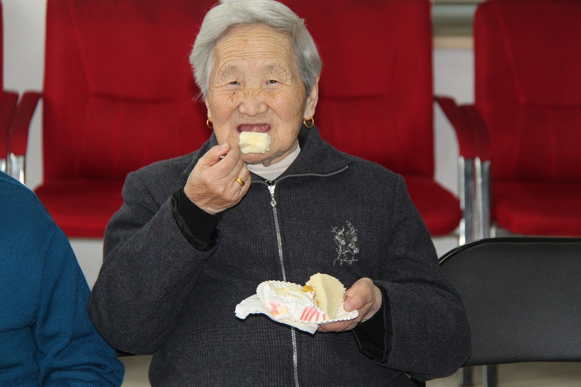 隨后,兩位壽星代表一起上臺,與大家齊唱生日歌,在祝福聲中吹滅蠟燭,笑的像孩子般開心,大家一起吃蛋糕,共同分享著這份喜悅和幸福。看著眼前的蛋糕,聽著像自己子女一樣的生日歌聲,老人們很感動。